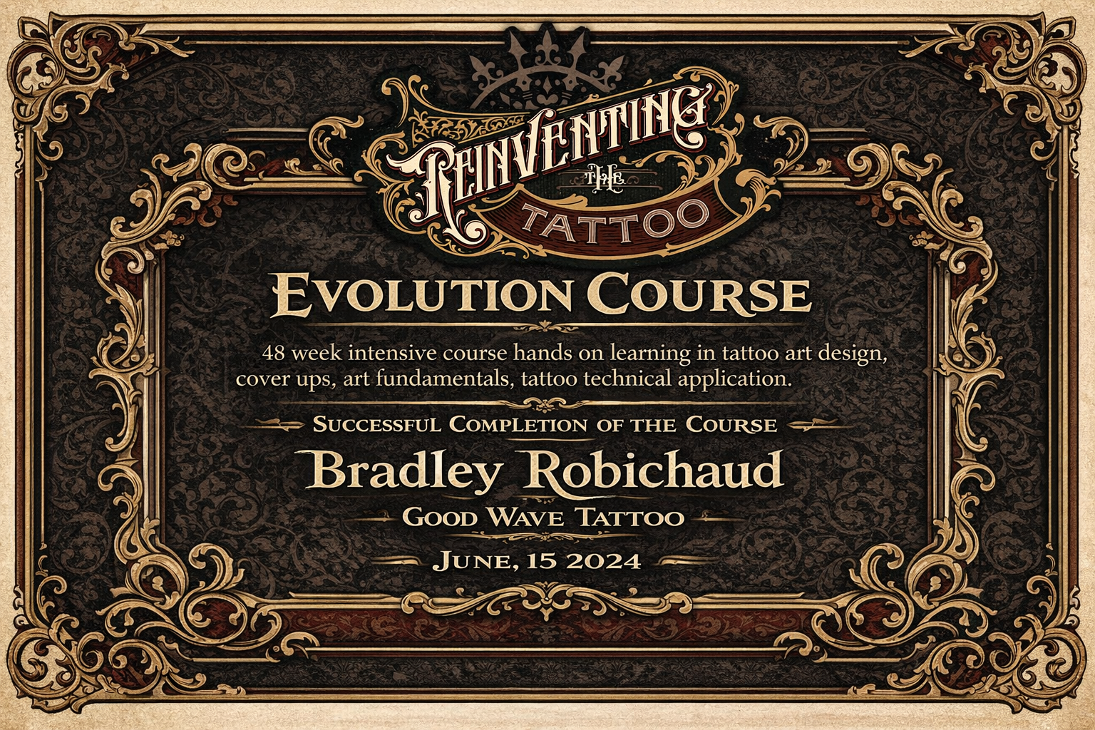 One course in particular changed everything—60 weeks of structured training with live zoom calls weekly, to get critiques on our homework from a world-class artists. Reinventing the tattoo - Evolution course. - That gave me a serious foundation in tattoo design , fit flow, contrast, colour theory, pos and neg relation ships , coverups, technical application and much more!