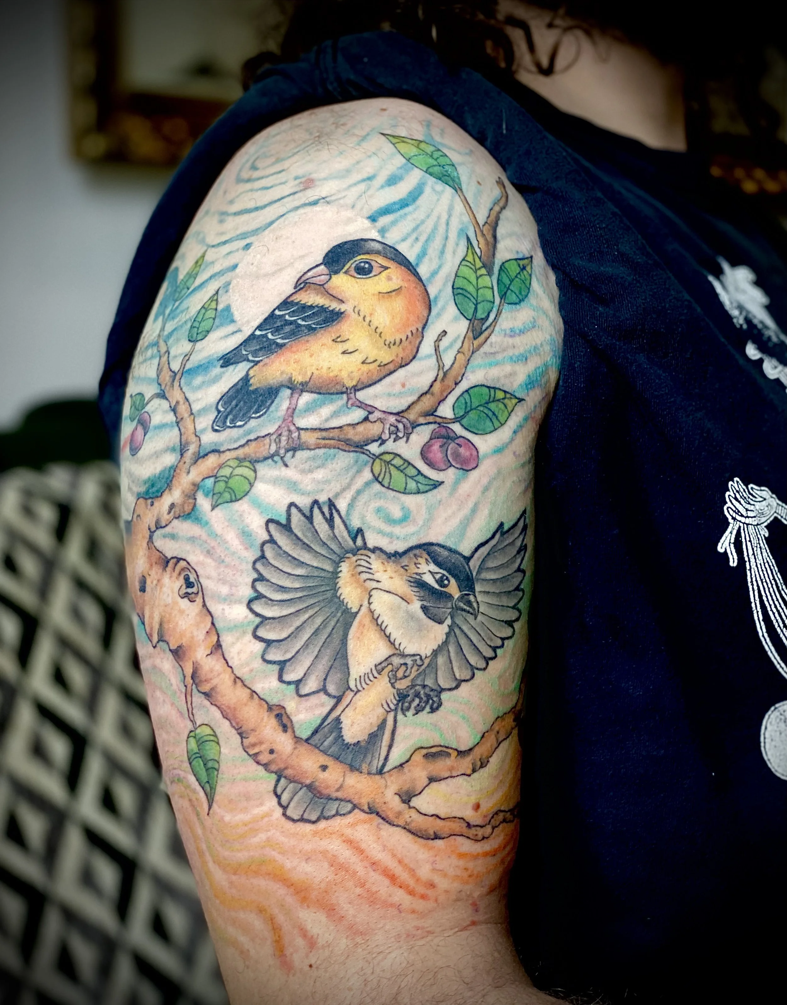 “I really love working in colour on botanical or nature inspired pieces. But equally love working with black and grey— I’m pretty much down for anything as I want to grow and learn as much as I can as I develop my own style”